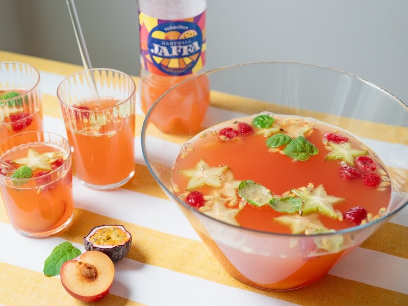 Hedelmäisen herkullinen ja kirpeän raikas alkoholiton booli syntyy Jaffa Hedelmäpommin ympärille. Katso helppo ohje ja valmista koko perheen booli.