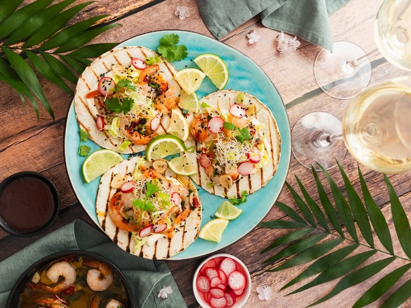 Nämä tacot yhdistävät espanjalaisen Gambas al Ajillon valkosipulilla ja chilillä maustetut katkaravut korealaisiin täytteisiin, kuten kimchiin, marinoituihin vihanneksiin ja gochujangiin. Tulos on suolainen, hieman mausteinen katkaraputaco, joka tuo yhteen kaksi kulttuuria raikkaalla ja mausteisella twistillä. Nämä Gambas al Ajillo -tacot sopivat täydellisesti espanjalaisen Marqués de Cáceres Verdejo -valkoviinin kanssa. Se täydentää hienosti tacojen makuja ja tuo raikkautta ja hedelmäisyyttä. Verdejon raikkaat sitrusmaiset ja hedelmäiset maut tasapainottavat oliiviöljyn ja valkosipulilla maustetun katkaravun täyteläisyyttä, samalla kun sen hapokkuus leikkaa chilin ja gochujangin mausteisuutta.