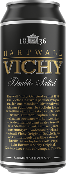 Hartwall Vichy Original on osa suomalaista historiaa. Sen synty ulottuu vuoteen 1836, kun Victor Hartwall perusti Pohjoismaiden ensimmäisen kivennäisvesien tuotantolaitoksen, jossa pullotettiin hiilihapotettua, kivennäisaineita sisältävää terveysvettä. Hartwall Vichy Original Double Salted on kunnianosoitus klassikon vahvoille juurille. Se sisältää kaksi kertaa enemmän natriumia, eli suolaa, kuin Original-versio. Hartwall Vichy Original Double Salted -veden runsaasti kupliva luonne yhdistettynä tasapainoiseen suhteeseen kivennäisaineita ja suolaa takaa perinteisen vahvan vichyveden voittamattoman maun.